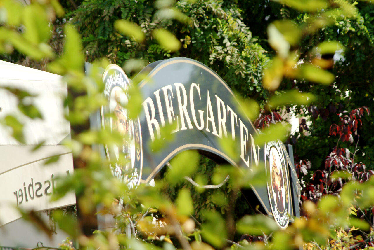 -Herrchen bürstet den Hund im Biergarten, weil das Fell verklebt ist.